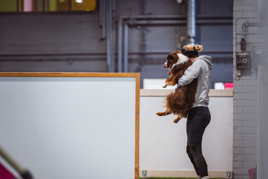 Tässäkö tämä nyt sitten on taas, mietin, mutta tsemppasin koiraa ja tein sen minkä pystyin. Rumo rakasti ratojen luukuttamista niin paljon, että onnistui unohtamaan lamaannuttavan pelkonsa lähdössä ja keskittyi tekemään. Sateen kastelemat tassut vaan eivät yhdessä kohtaa pitäneetkään tekonurmella, ja Rumo liukui hypystä ohi. Kielto.